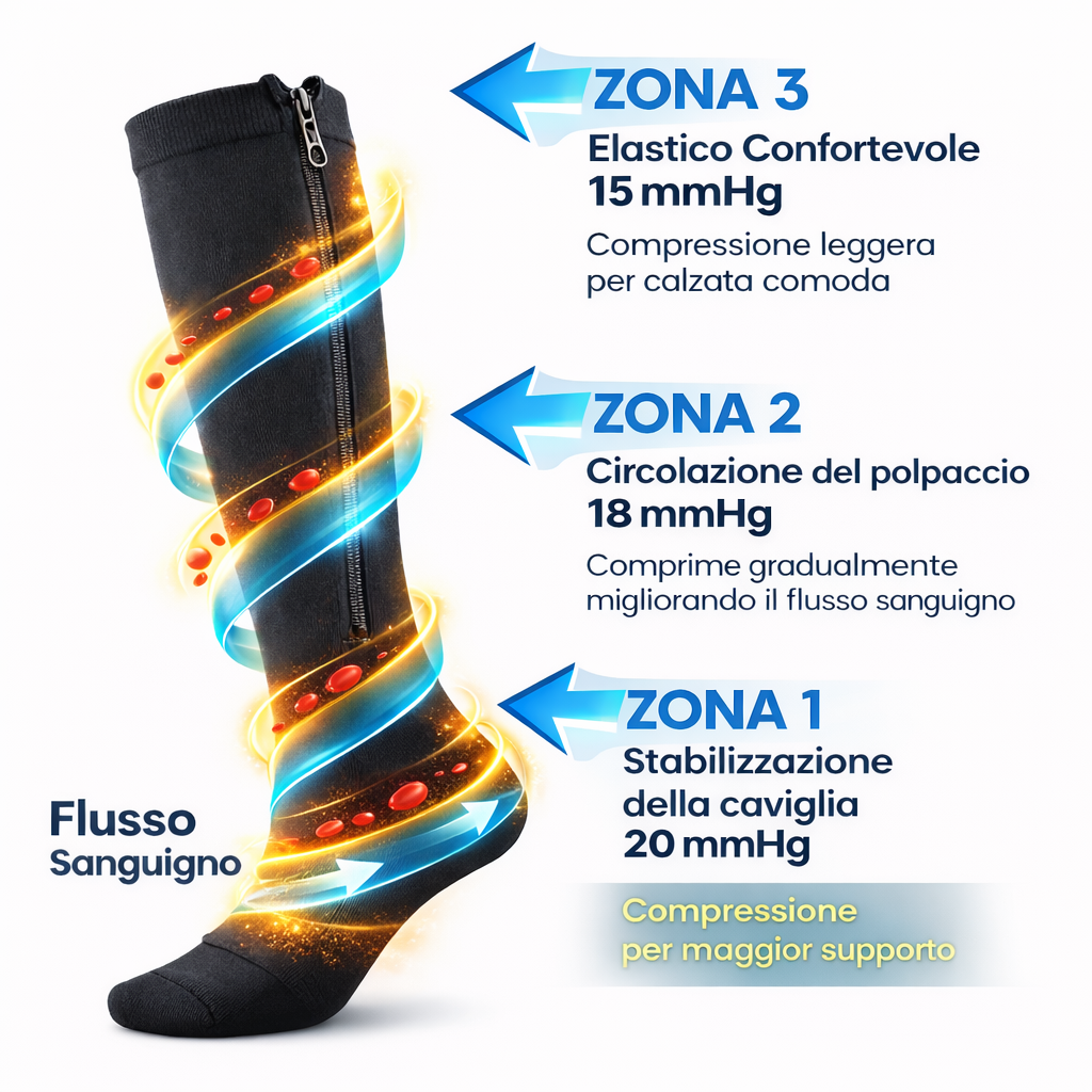 Una volta chiusa la zip, grazie alla tecnologia V-TECH a 3 zone, la calza esercita una compressione graduata più intensa alla caviglia e progressivamente più leggera verso il polpaccio, ma senza lo stress di infilarla.